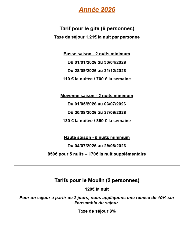 Tarifs & Contacts Tarifs du gîte et du Moulin pour 2025, incluant les périodes de basse, moyenne et haute saison. Nous joindre Christophe : 06.63.98.00.33 Cathy : 06.20.05.66.47 Contactez-nous par mail Instagram